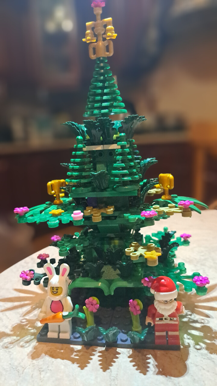 Яркая композиция из LEGO создаёт уютную зимнюю сцену. В центре — нарядная ёлочка из зелёных кирпичиков, украшенная разноцветными детальками-игрушками. Под её пушистыми ветвями расположились две фигурки: величественный Дед Мороз в красной шубе и милый человечек в костюме зайчика с длинными ушками. Эта миниатюрная история из кубиков передаёт волшебство и тёплую радость новогоднего праздника. Вся магия Нового года в одной миниатюрной композиции! ❄️🎄🐰