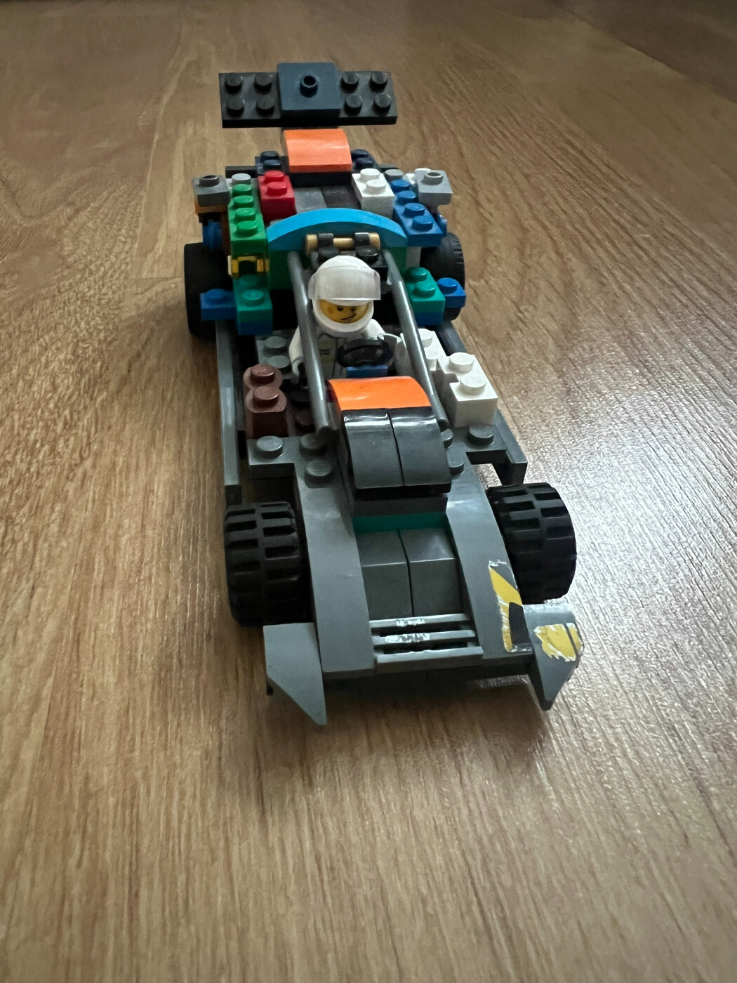Гоночный автомобиль - моя любимая игрушка. Сзади у машины огромное чёрное крыло, оно прижимает её к полу, чтобы она не подскакивала на поворотах и могла легко обгонять соперников на каждом круге. Впереди гладкий капот, что позволяет машине иметь высокую обтекаемость. Каждый раз, когда эта машина несётся по комнате, кажется, что начинается настоящий чемпионат.