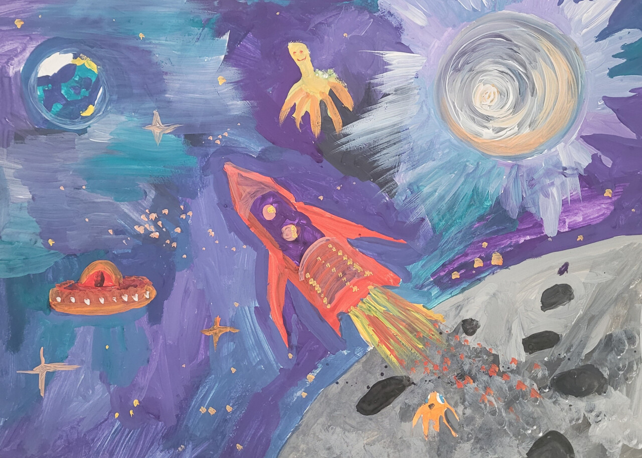 Работа "Вперед, в космос!". Выполнено гуашью.