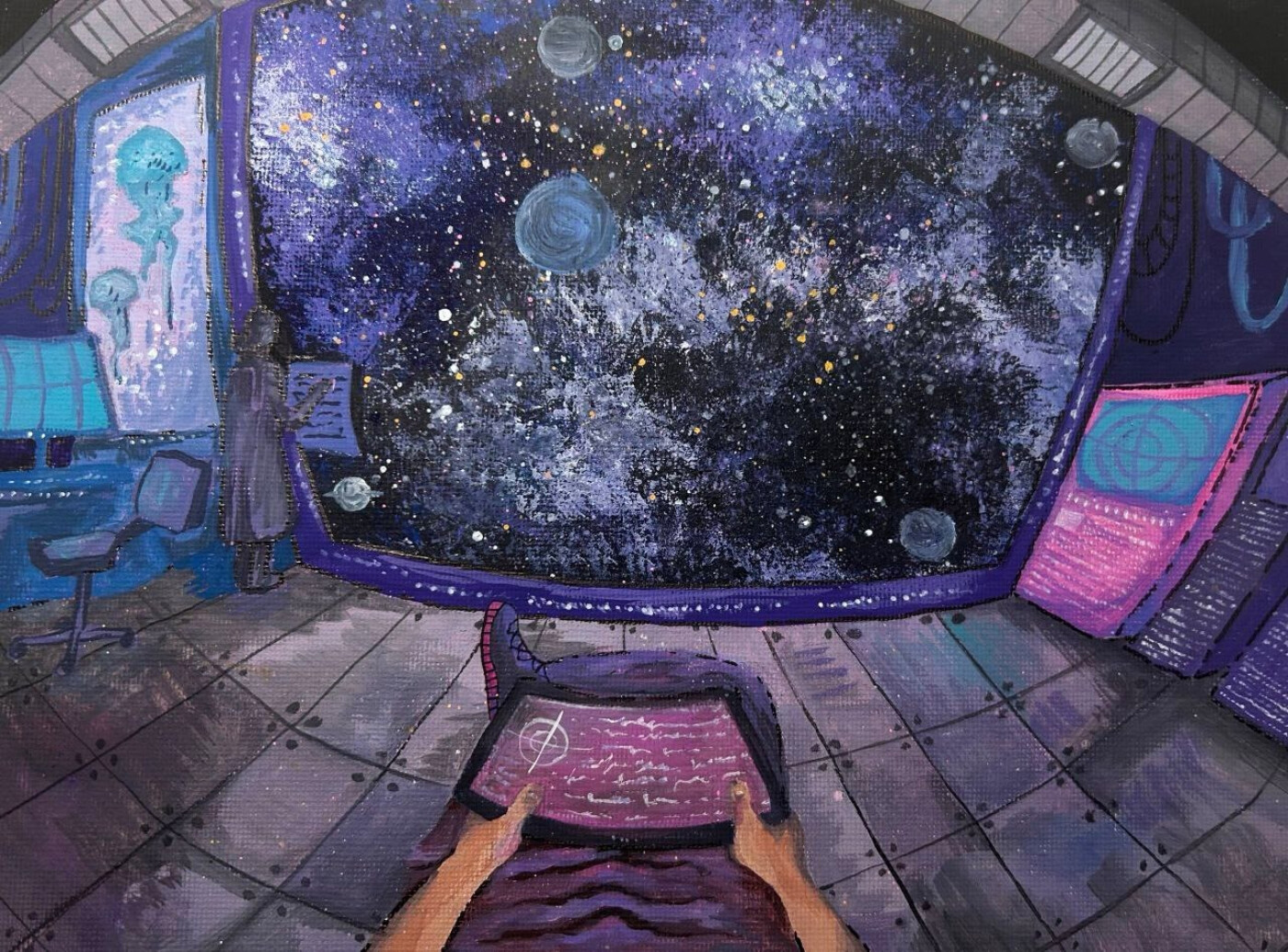 В мягком, рассеянном свете приборов и мониторов, внутри модуля космической станции находятся космонавты. Их лица освещены не только лампами, но и холодным, величественным сиянием, льющимся из огромного иллюминатора. Они работают — проверяют данные, делают записи в бортовом журнале, — но взгляд одного из них на мгновение отрывается от экрана и устремляется вперёд.За толстым стеклом, испещрённым бликами и отметками, разворачивается грандиозная картина: на бархатно-чёрном небе, усыпанном мириадами немигающих звёзд, висят огромные шары планет со своими спутниками. Тишина и покой станции контрастируют с бурлящей жизнью вселенной за стеклом, а космонавты выглядят не просто наблюдателями, а частью этого бесконечного мира. Это не просто картина, а кадр из жизни первопроходцев, для которых работа в окружении планет и звёзд стала привычной, но не менее величественной реальностью.