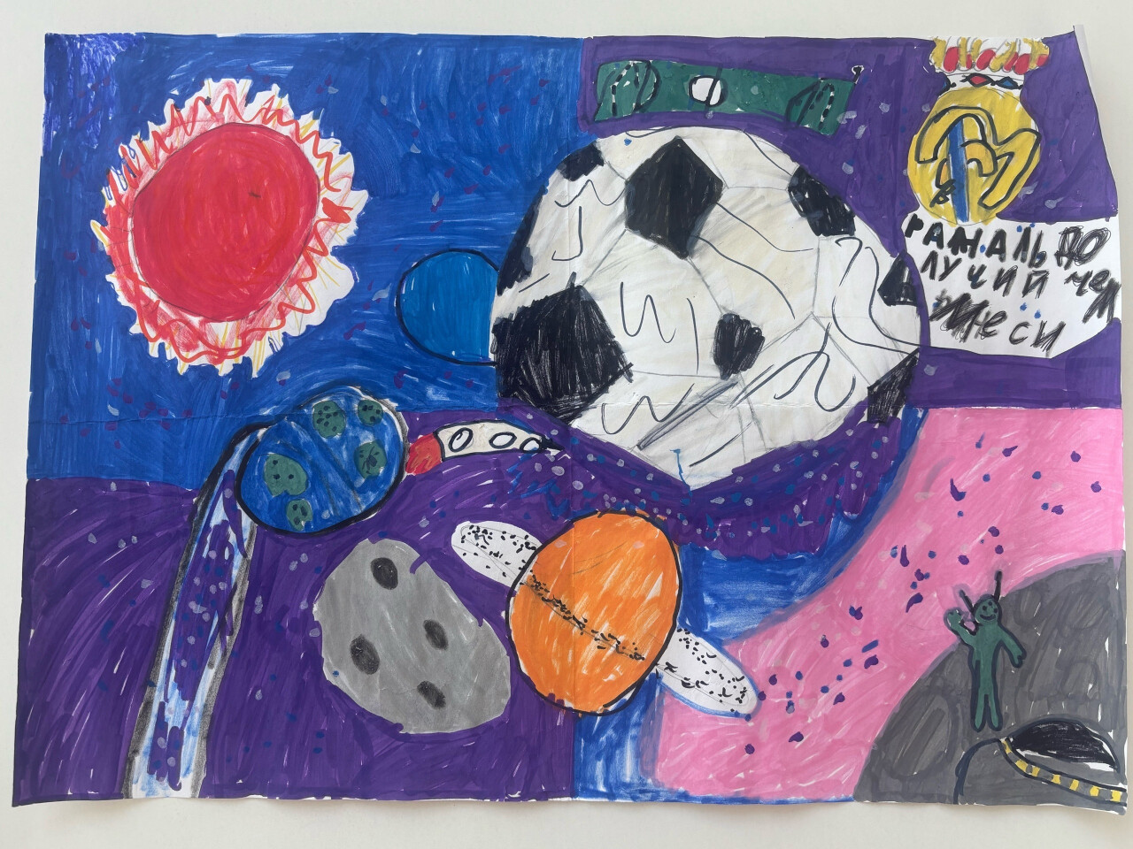 На картине изображен космос, планеты, а также футбольный мяч также в виде планеты. Ребёнок очень любит играть в футбол и представил что где-то есть такая планета в форме футбольного мяча, где живут только инопланетяне-футболисты.
