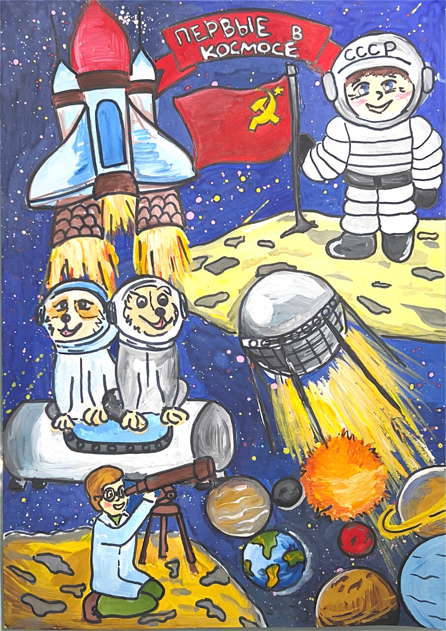 Первые в космосе. В данном рисунке я хотел показать все этапы освоения космоса. Вначале ученый изучает космос, потом запускается первый спутник, первые космонавты-собаки, первый космонавт-человек, запуск ракет.