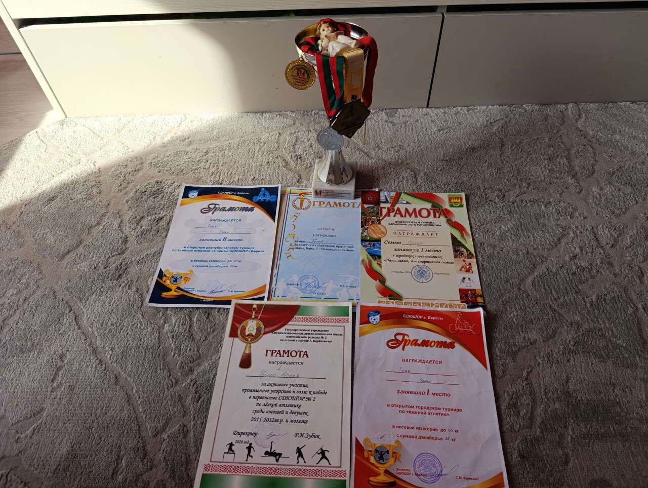 Моя дочь Дарья имеет призовые места 1 и 2 степени за достижения в лёгкой и тяжёлой атлетике. Также достижением является кубок