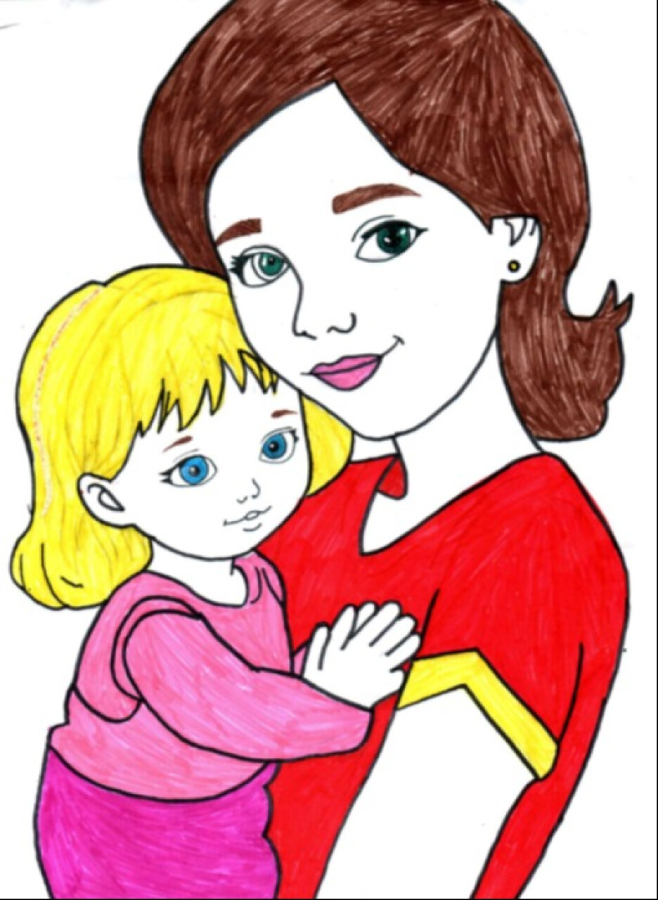 Рисунок, выполненный фломастерами на формате А4, передает момент теплой близости между мамой и дочкой. Мама обнимает свою дочь, и в их объятиях чувствуется безграничная любовь и забота. Теплые тона, использованные в рисунке, создают ощущение уюта и радости, подчеркивая ценность семейных уз. Эта работа – искреннее посвящение Дню матери и трогательное изображение самой важной связи в жизни.