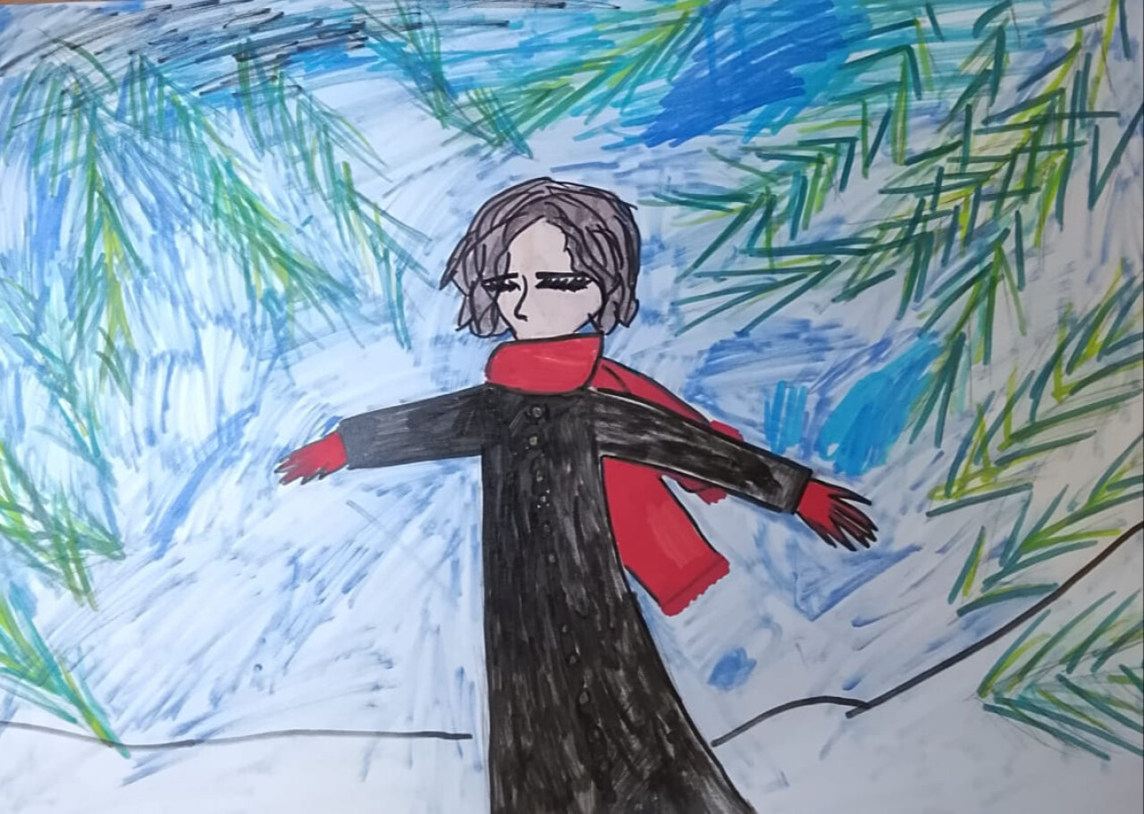 Это моя мама в снежном парке. Она идет и улыбается. Я хотела нарисовать самую красивую маму на свете. У меня получилось! Я ее очень люблю!