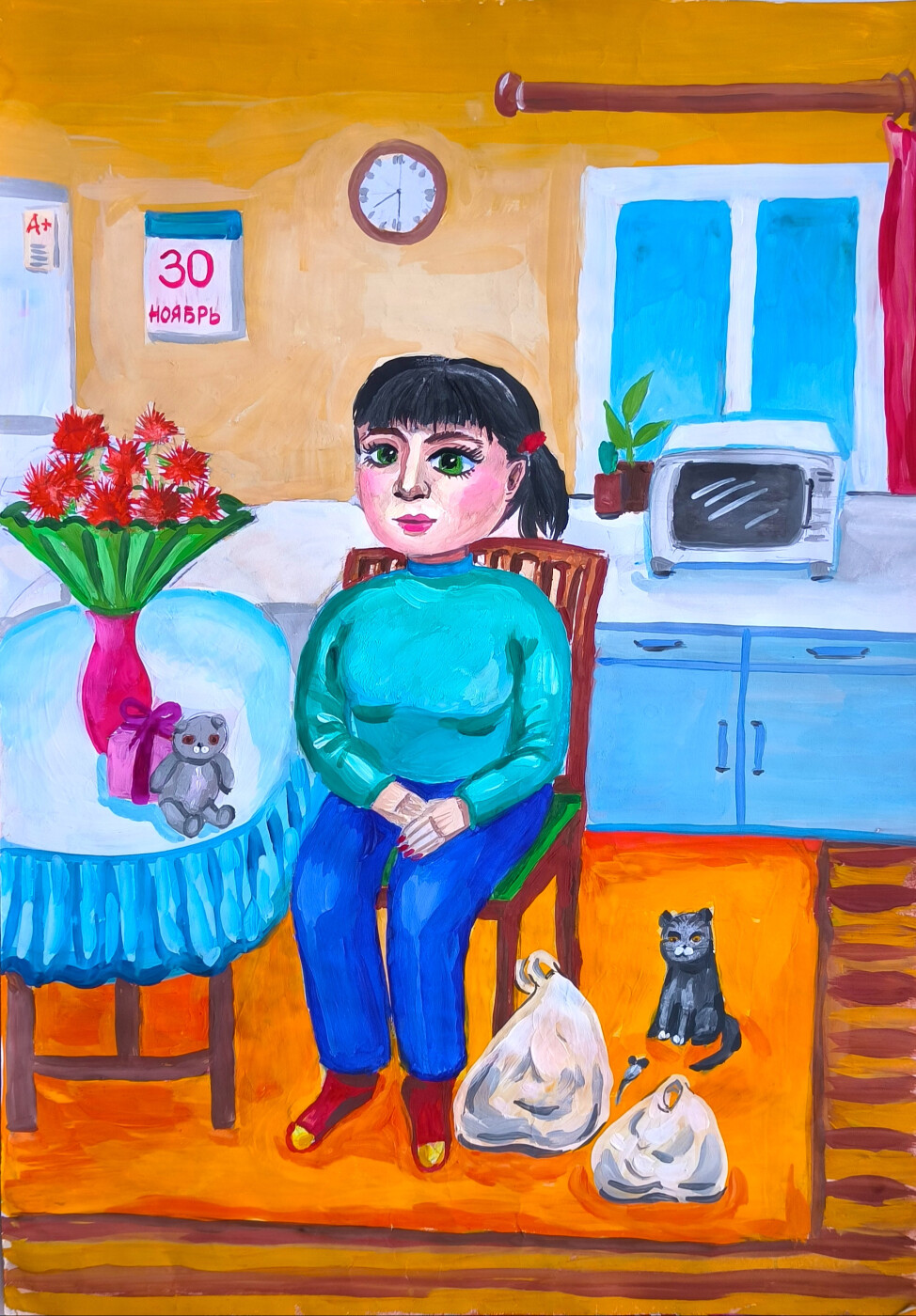 День матери. Мама только что вернулась с работы. По дороге зашла в магазин. Купила домой к ужину много вкусностей. А на кухне ее ждал букет цветов и подарок от меня с братом. Мы поздравили её, потому что мы ее любим и ценим. Мамочка самый важный для нас человек.