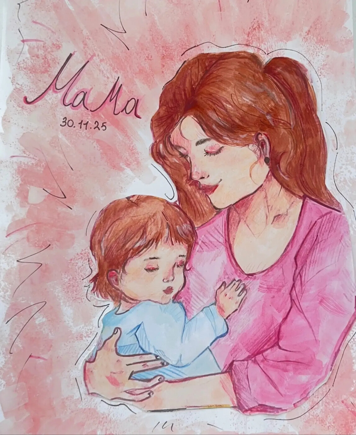 На моем рисунке - мгновение, в котором живёт любовь. Я изобразила маму, которая с трепетом и нежностью держит на руках своего малыша. Я специально сделала акцент на прикосновениях - мамина ладонь нежно обнимает малыша и рука малыша, которую он приложил к маминому сердцу. Это не просто жест, а символ того, что мама всегда рядом, всегда поддержит. А ребёнок чувствует невероятную защиту и всобъемлющую любовь своей мамы. Ведь нет ничего дороже на свете, быть рядом с мамой и чувствовать ее тепло.