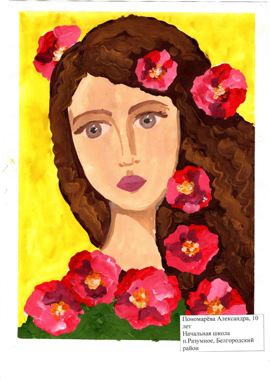 Работа Пономарёвой Александры, учащейся 4 "А" класса Начальной школы п.Разумное "Самая красивая женщина на свете - мама"