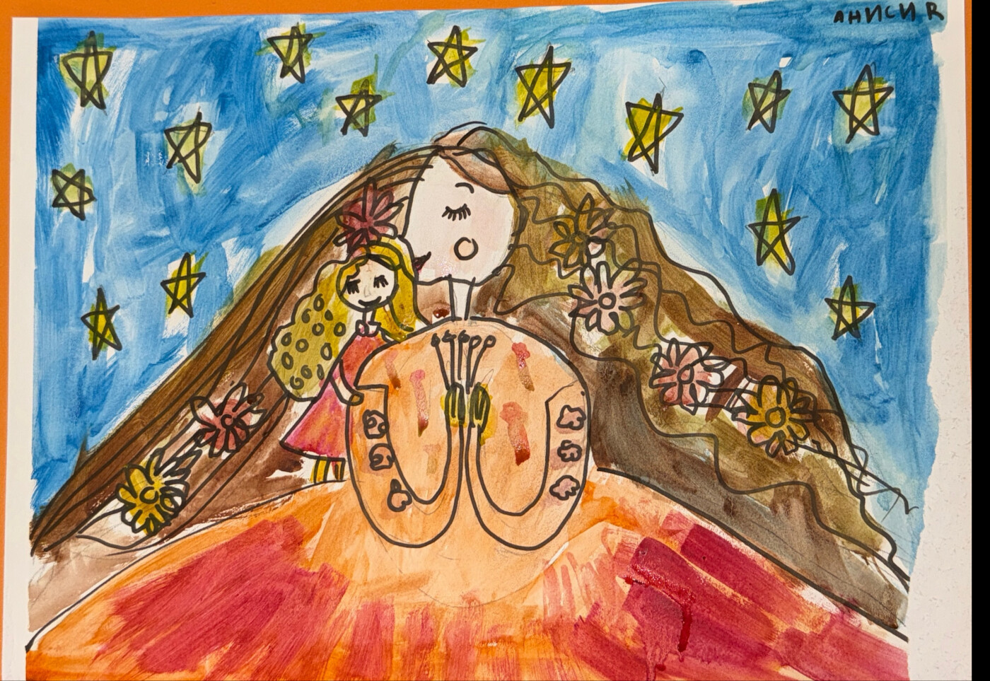 Тёплая и искренняя картина, где мама с длинными цветами в волосах бережно обнимает ребёнка на фоне звёздного неба. Яркие оранжево‑красные тона платья сочетаются с голубым фоном — образ передаёт защиту, любовь и уют, типичные для праздника Дня мамы.