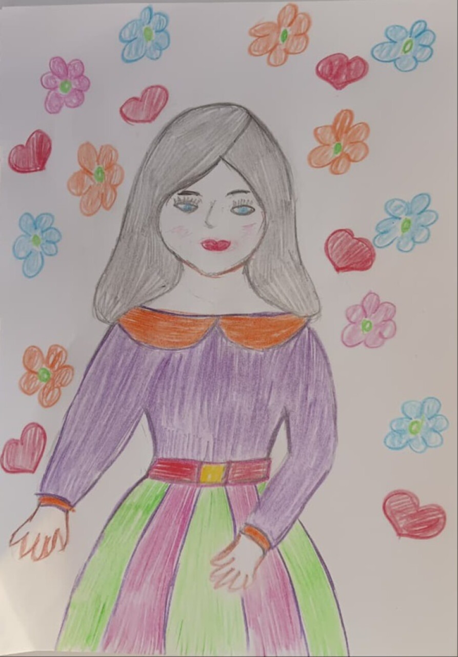 Моя мама, она всегда красивая. Любит носить яркую одежду, и красит губы. Я ее люблю, поэтому вокруг нее сердечки и цветы.