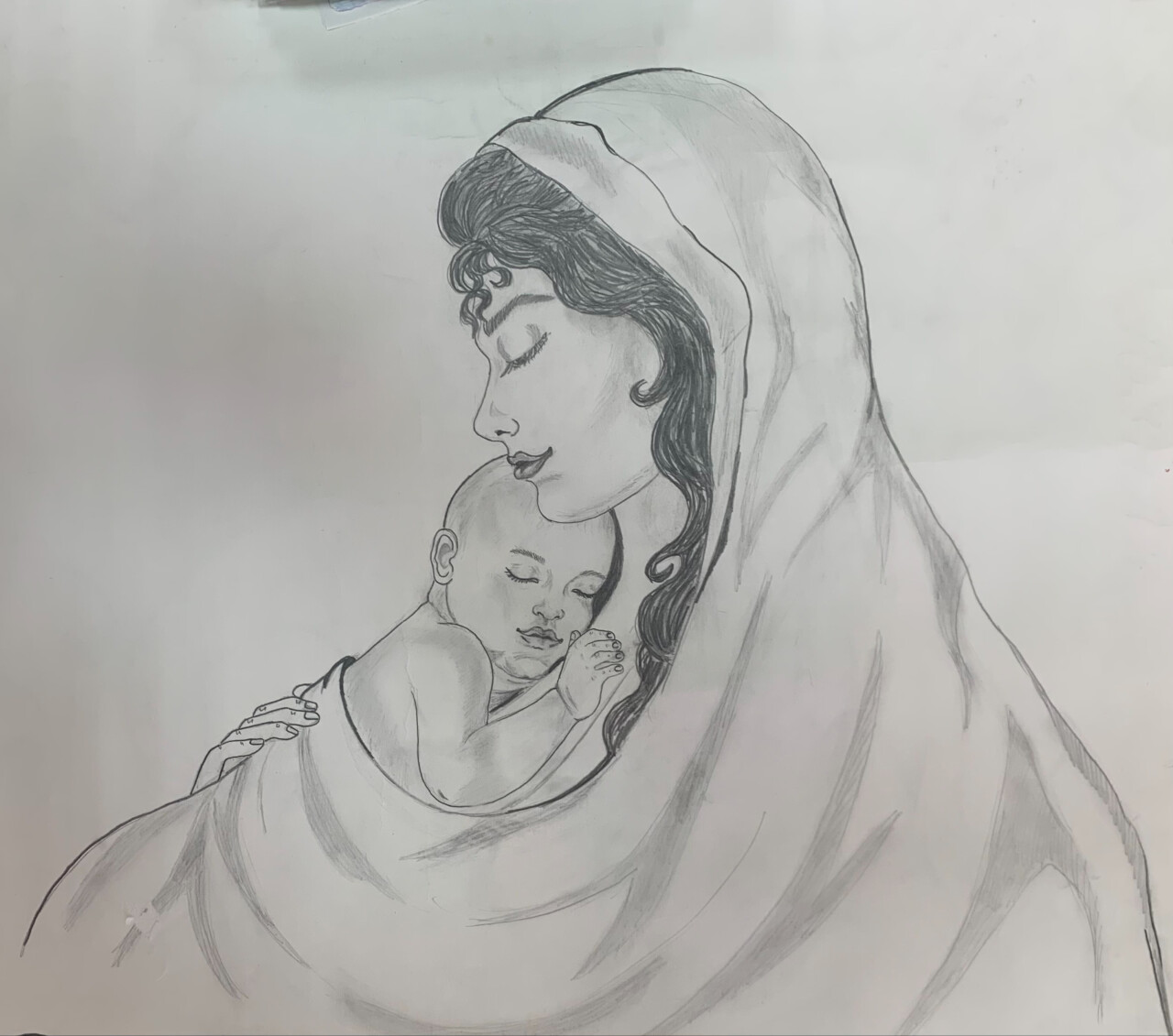Этот трогательный рисунок ярко иллюстрирует великое значение матери в жизни каждого человека. Художник мастерски передал нежность и теплоту образа женщины, чьи руки бережно поддерживают малыша, словно охраняя его путь на Земле.