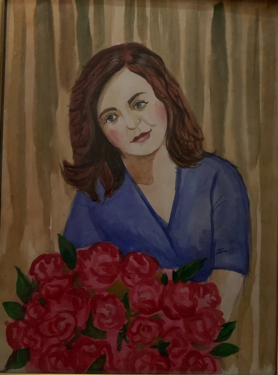 На рисунке представлен портретный образ мамы, дополненный изящным элементом — цветами. Работа выполнена в нежной акварельной технике, которая придаёт изображению особую воздушность и лиричность.