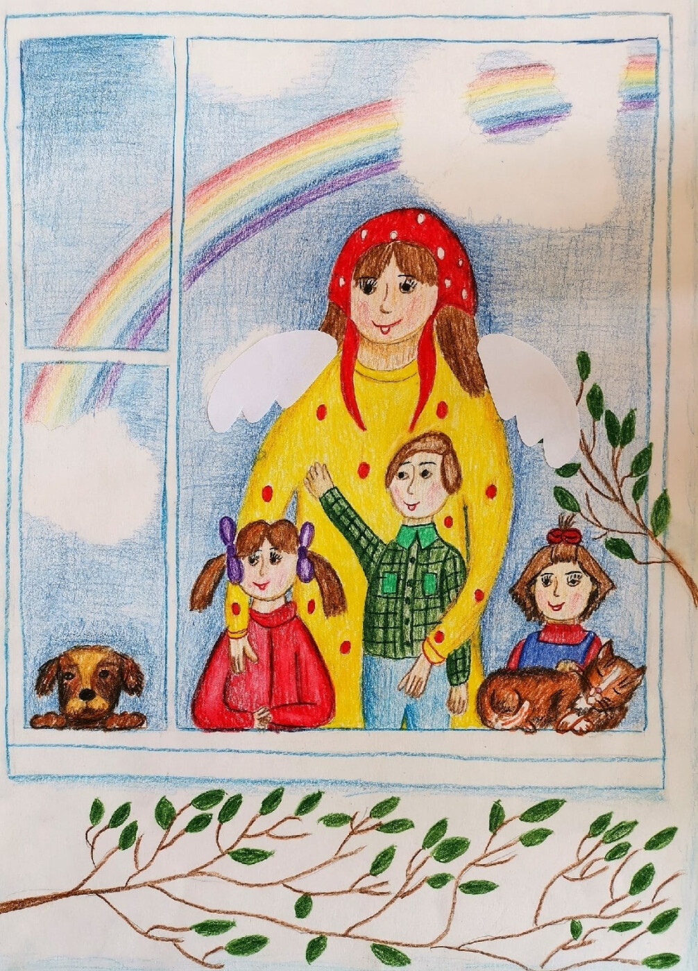 Мама вместе с сыном и дочкой выглядывают из окна, любуясь радугой. Яркие цвета небесной дуги отражаются в глазах детей, а домашние животные — кошка и собака — дополняют картину домашнего тепла. Рисунок словно иллюстрирует фразу: «Мир цветной, когда мама рядом» — именно мама создаёт ту атмосферу, в которой всё вокруг расцветает красками.