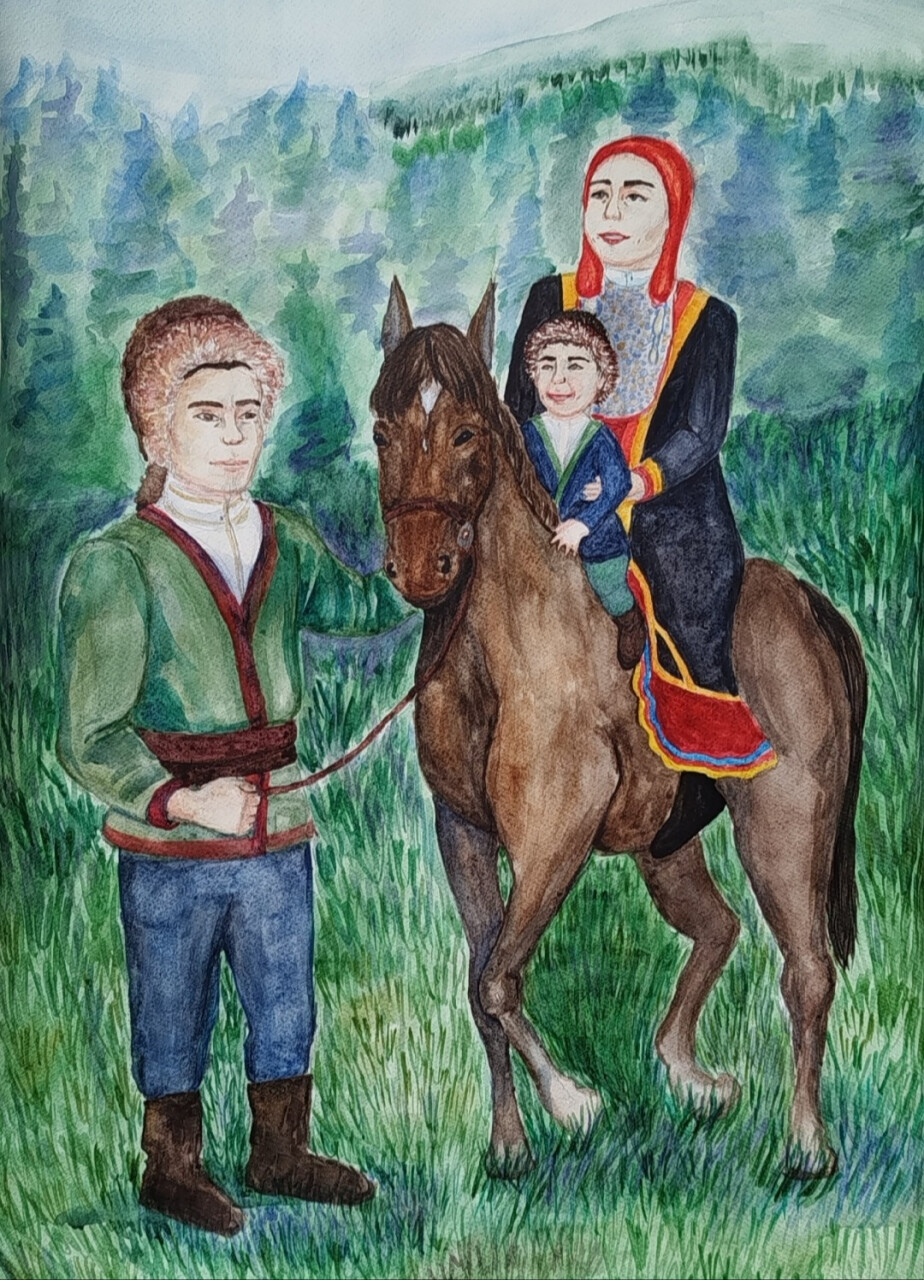 " Башкирская семья" 2024 г , бумага, акварель, 42×60