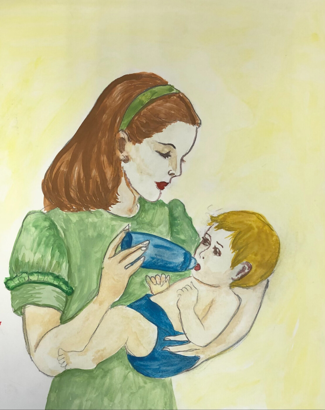 Мама изображена с добрым взглядом, отражающим нежность и терпение. Мамина любовь бесконечна.