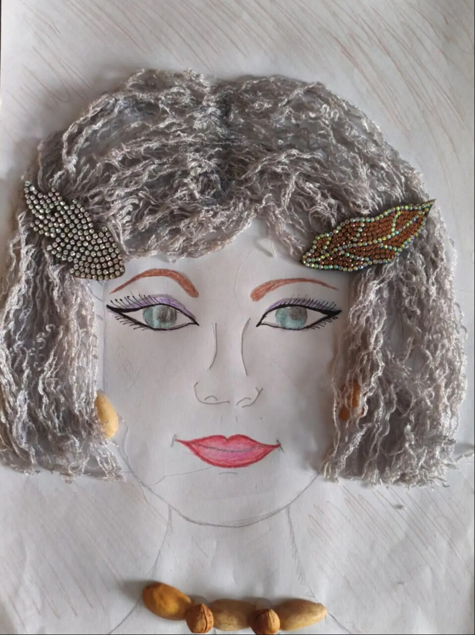 Работа выполнена в комбинированной технике рисунок+ поделка.