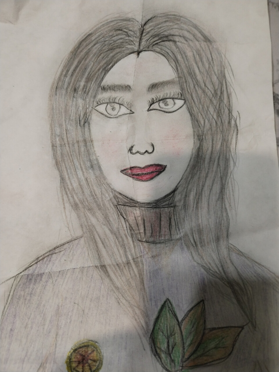 На рисунке — доброе, улыбчивое лицо мамы. Тёплые глаза с ласковым взглядом, нежные очертания губ, лёгкий румянец. Черты лица мягкие, передающие заботу и любовь. Рисунок выполнен цветными карандашами.