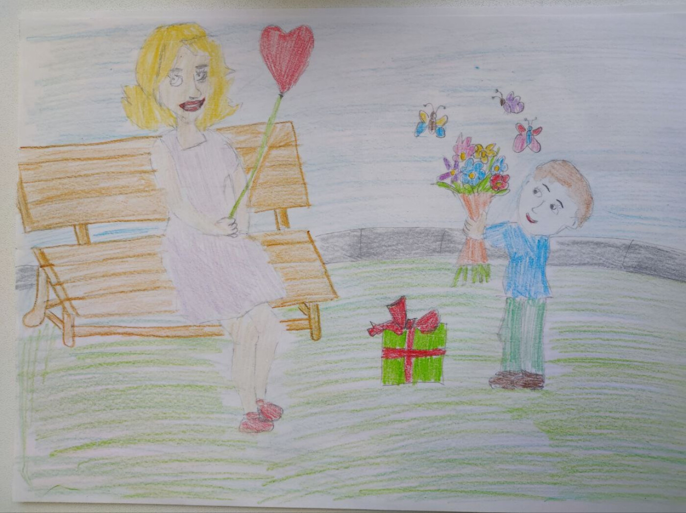 Рисунок выполненный цветными карандашами. На рисунке изображена мама с сыном
