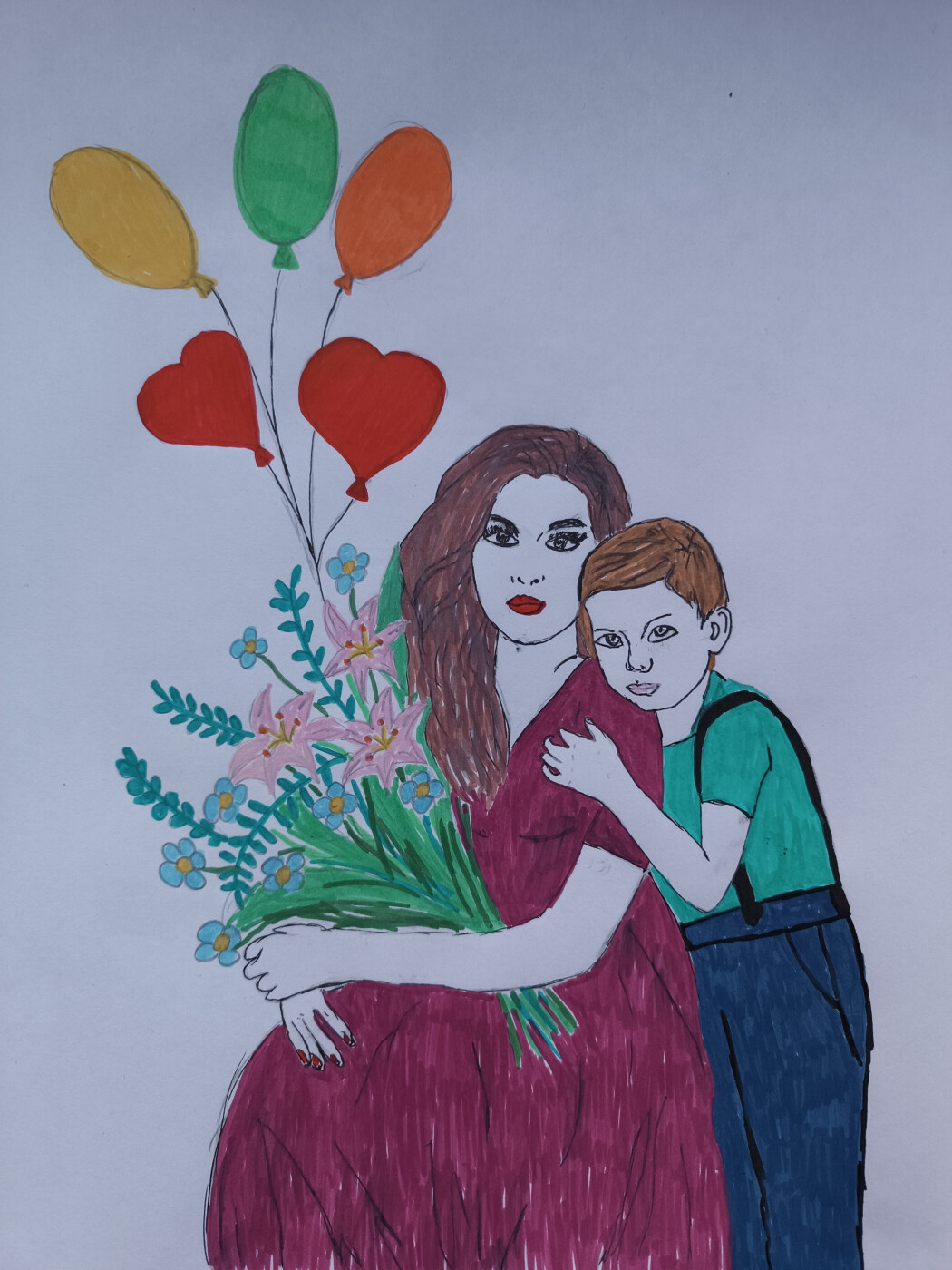 На рисунке изображены мама с сыном полные любви и нежности. В маминых глазах читается безграничная любовь и забота. Сын обняв маму чувствует себя защищённым.