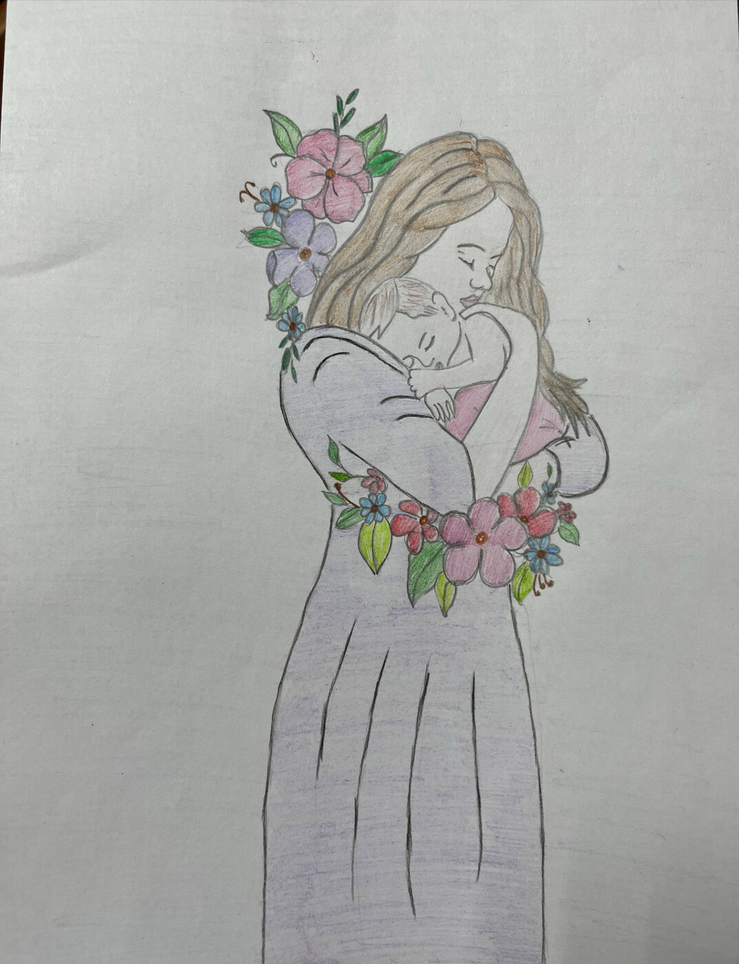 На моем рисунке изображена самая дорогая картина моего детства — моя любимая мама нежно держит меня на руках, когда я была совсем крошечной. Её ласковый взгляд полон тепла и заботы, а мои маленькие ручки доверчиво прижимаются к её груди. Это мгновение запечатлено навсегда в моём сердце, оно напоминает мне о том, насколько сильна наша связь и как важна взаимная поддержка.