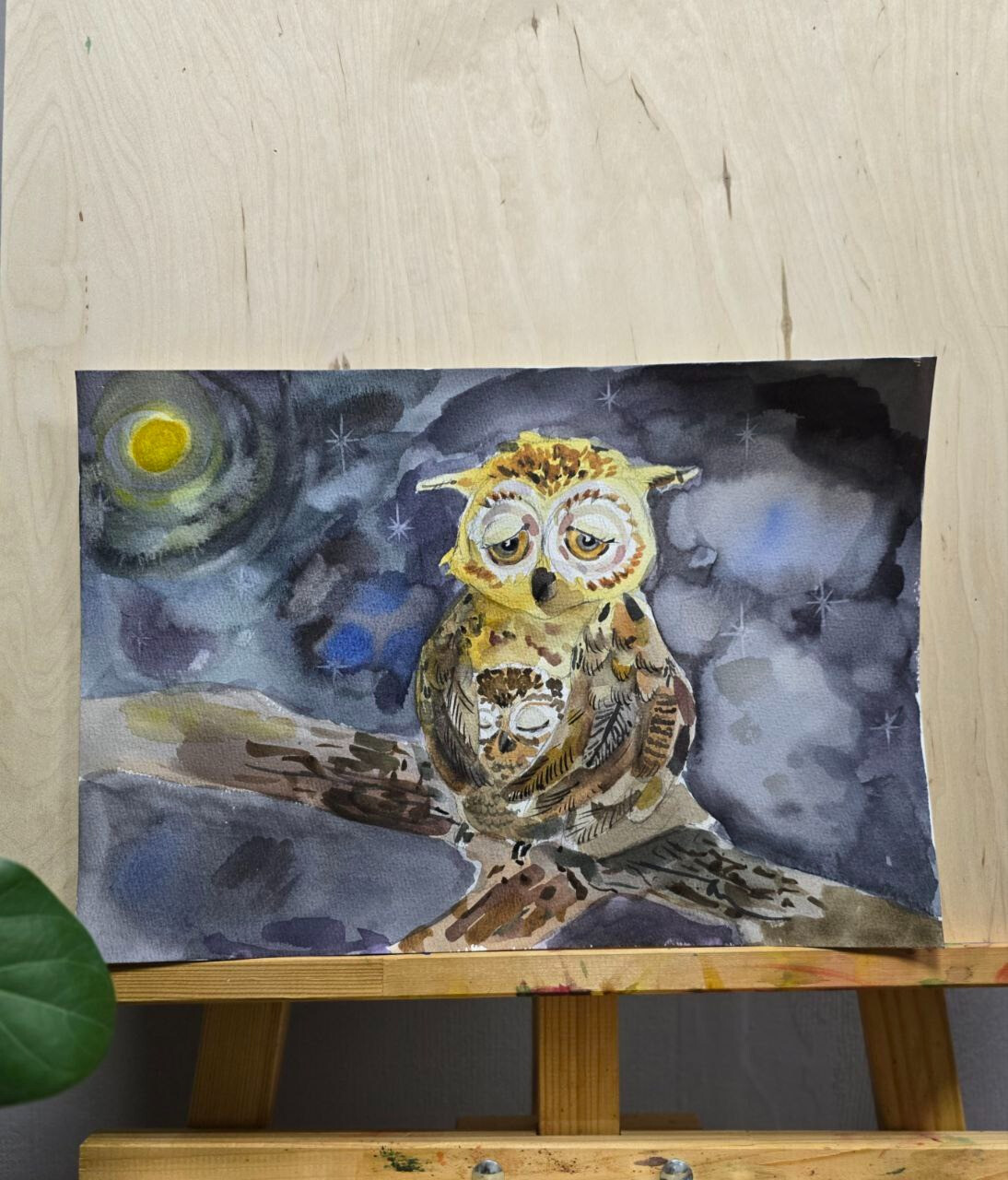 В своей работе я нарисовала маму сову, которая даже в самую темную ночь оберегает сон своего совенка.