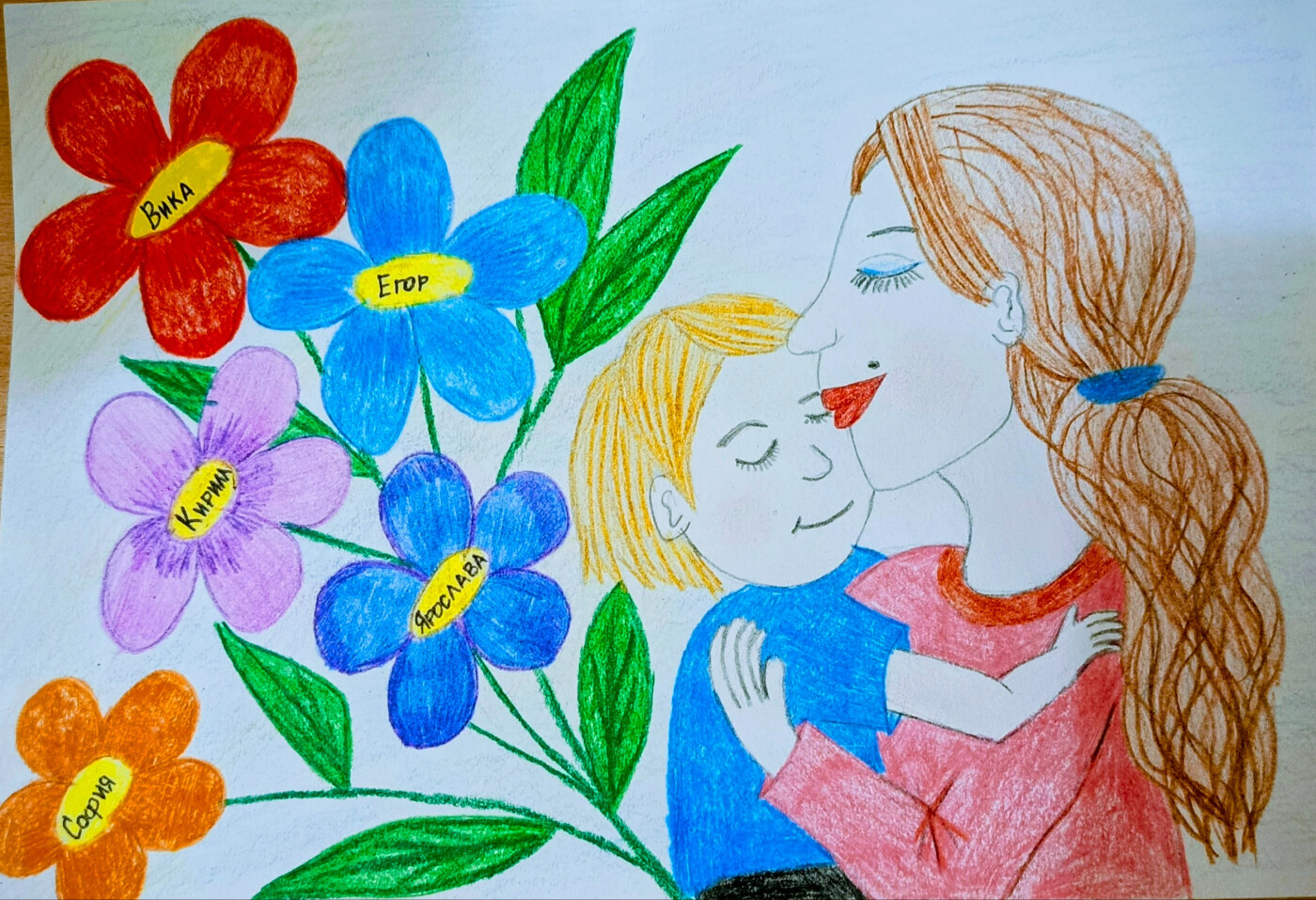 Я люблю свою мамочку. Очень хочу её порадовать. Она ласково называет нас цветочками, как видно из моей работы нас у мамочки 5 цветочков.