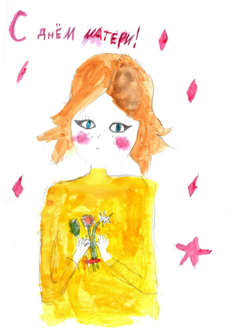 Конкурсная работа ученицы 2 класса Юлианы Креер. На рисунке изображена мама с букетом цветов.
