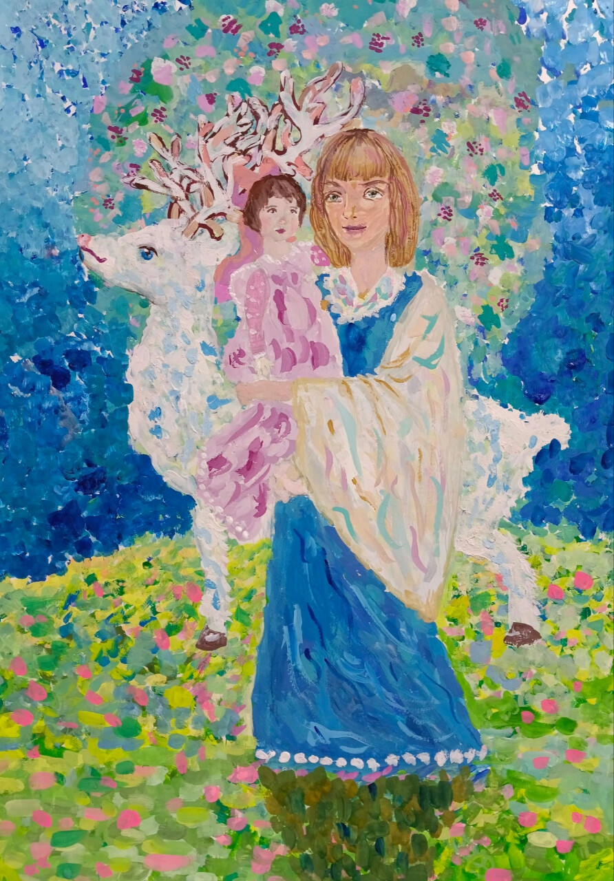 На опушке сада, среди цветущих ветвей, замер изящный олень. Длинные ветвистые рога придают ему благородный, почти сказочный облик. Он не боится людей — видимо, привык к их присутствию в этом мирном месте. Рядом стоит мама с малышом на руках. Она одета в лёгкое светлое голубое платье, её волосы мягко обрамляют лицо. Женщина нежно прижимает к себе ребёнка.. Малыш, заворожённый красотой окружающего мира, с любопытством разглядывает цветы и оленя.