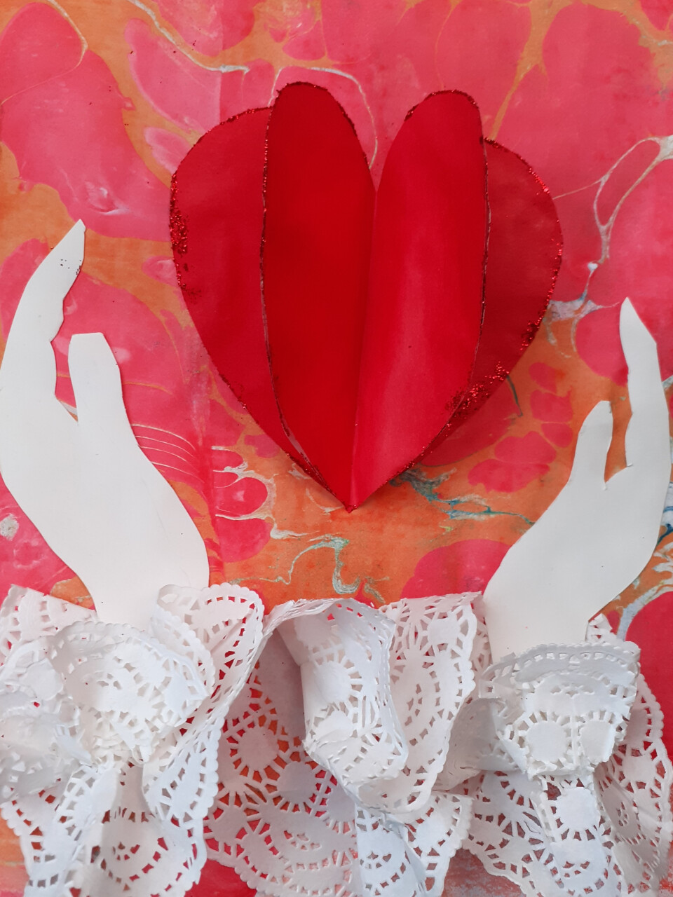 Работа выполнена совместно с ребенком и мамой. Фон работы сделан в технике Эбру. Работа выполнена комбинированным способом. Ребенок с ОВЗ. Параллельно с выполнением работы рассказывались авторские стихи преподавателя о маме. Готовили маме сюрприз.