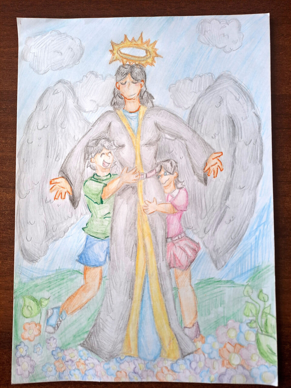 В честь Дня матери Анастасия создала рисунок "Под маминым крылом". На нем изображены мама и дети, которые выражают ей свою благодарность за нежность, заботу и любовь. Дети, в свою очередь, дарят матери свою безусловную любовь.