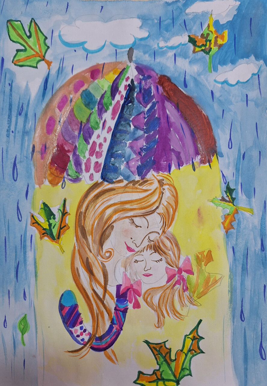 Когда вокруг холодно и сыро и дет дождь, а мы с мамой под одним зонтом , сразу так тепло и уютно. Я хочу сказать, что мама всегда излучает тепло, нежность. Этот рисунок напоминает о том, что самые простые моменты, проведенные с близкими, могут быть наполнены настоящим волшебством.