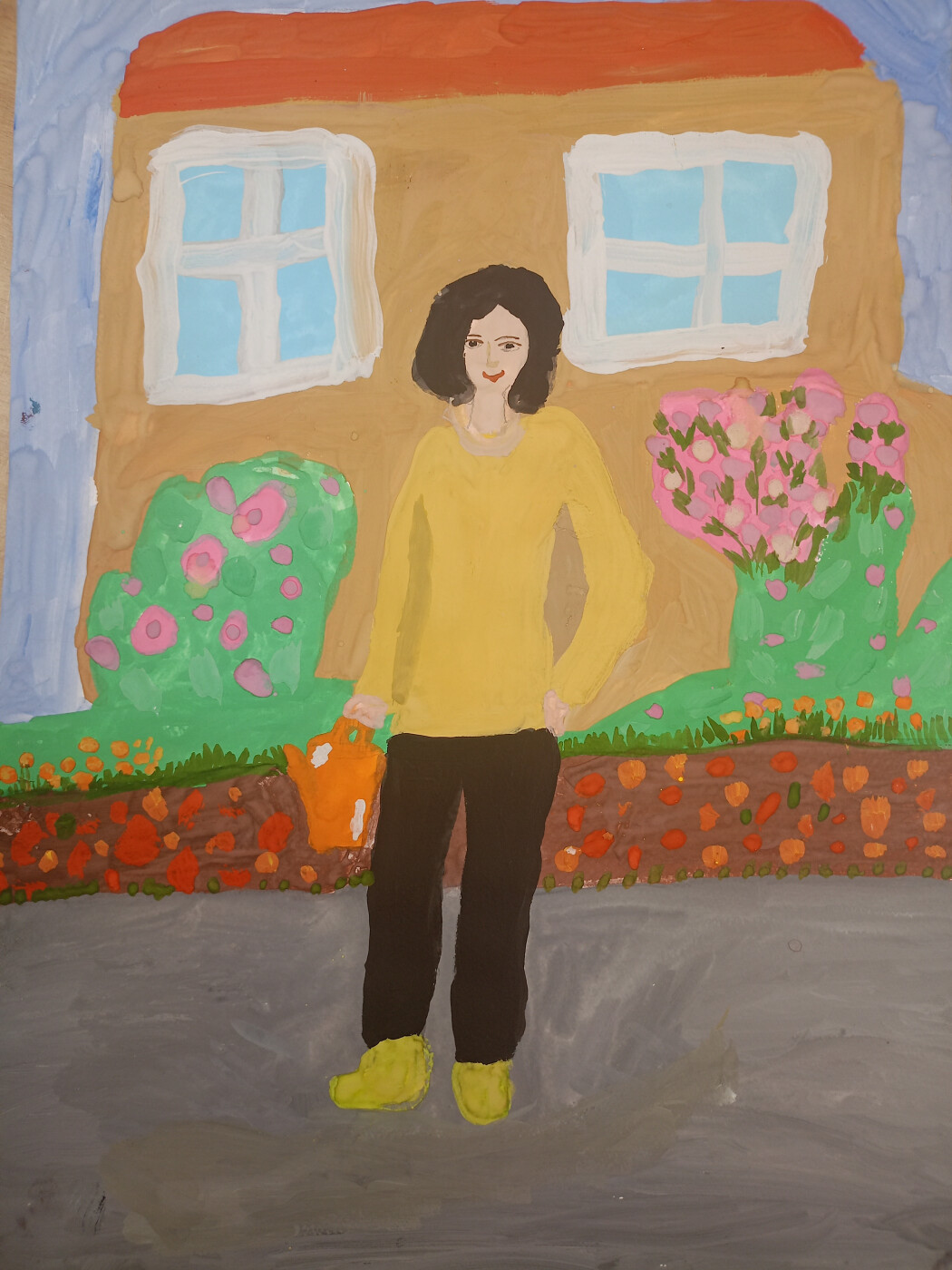 Здравствуйте, менят зовут Арина. Я изобразила маму в саду. Она очень любит украшать сад цветами, это её хобби. По образованию она флорист