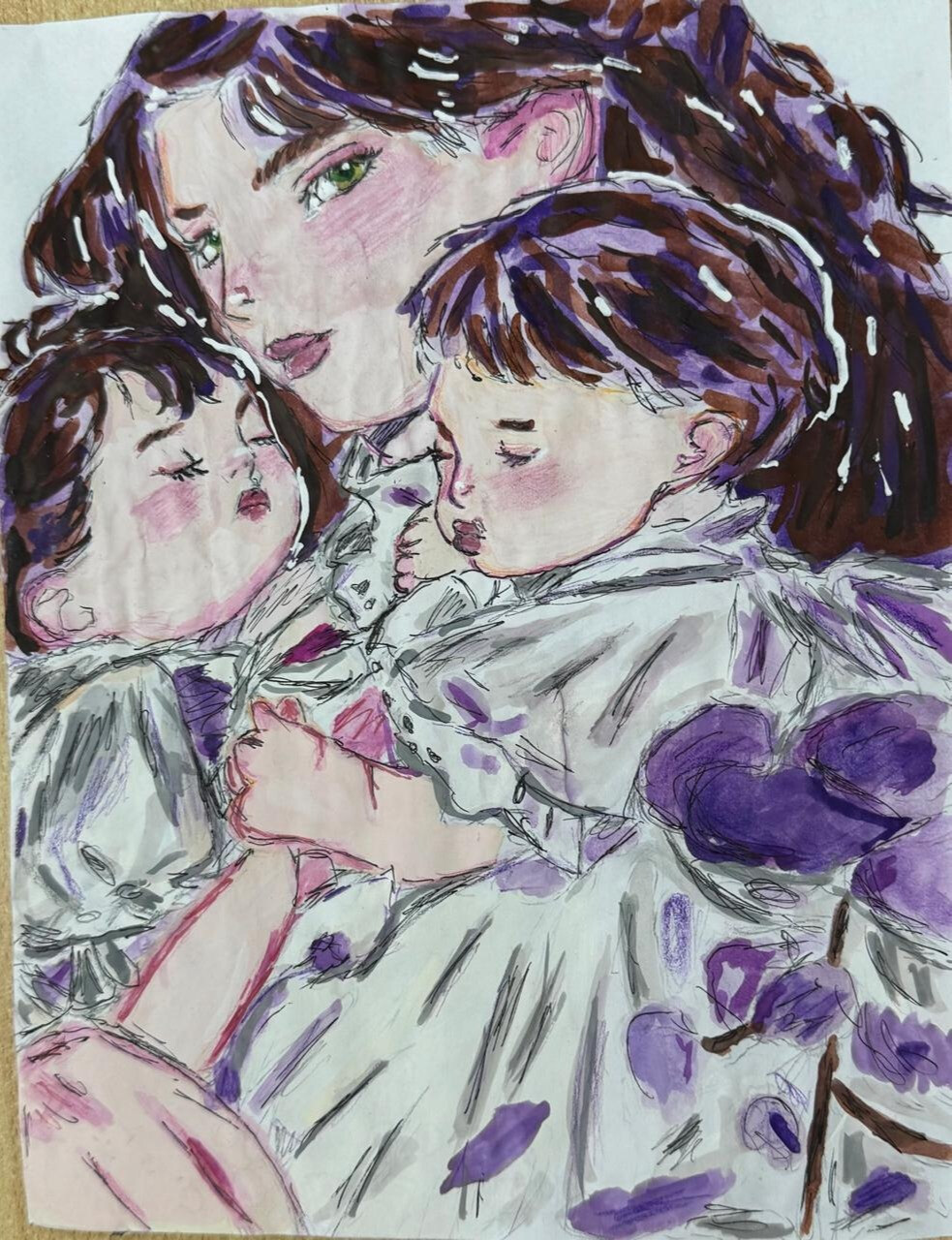 На рисунке изображена улыбающаяся мама с ласковыми глазами. В руках у неё дети как часть её души и сердца. Всё в этом образе говорит о нежности и материнской доброте.