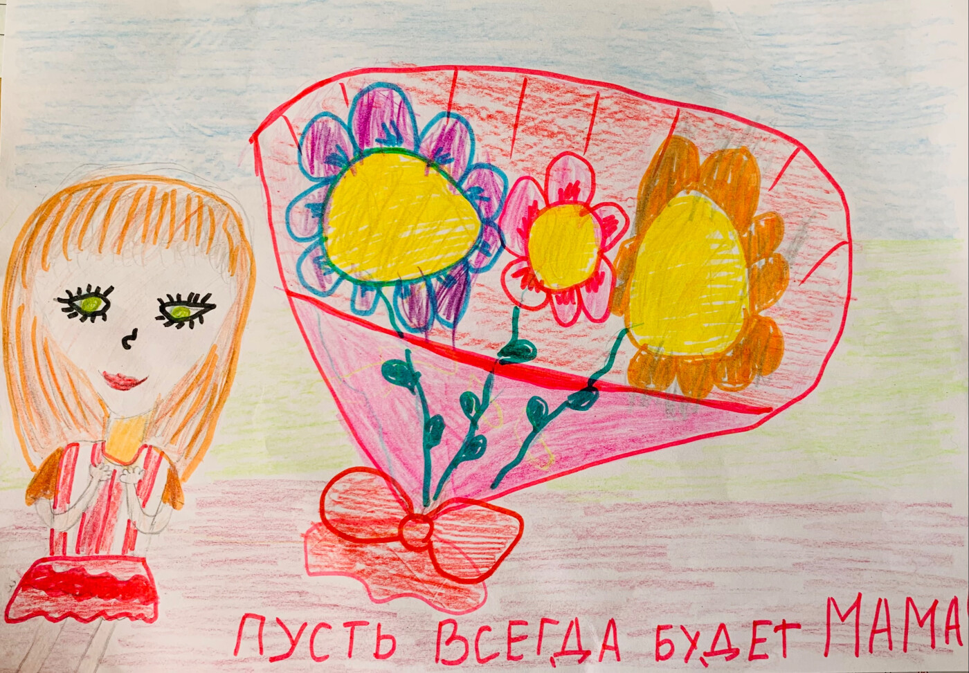 Марина нарисовала маму в ее день рождения, она изобразила маму, которая восхищалась ее букетом цветов.