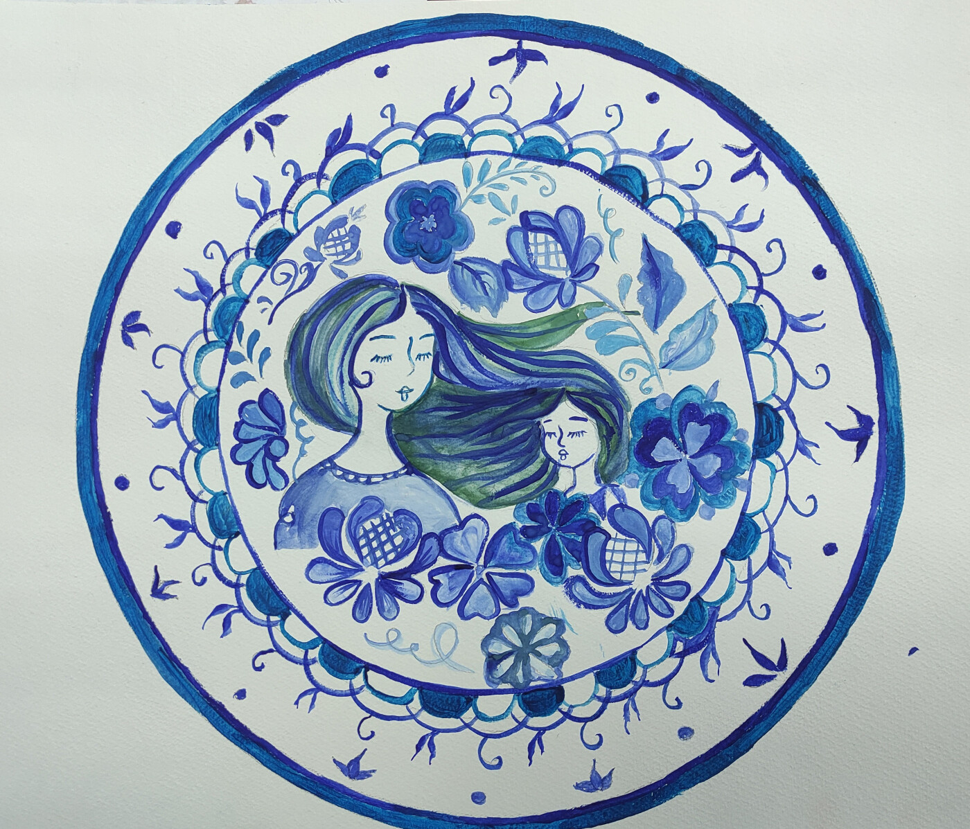 работа "Среди цветов" выполнена гуашью, элементами русской росписи в стиле гжель