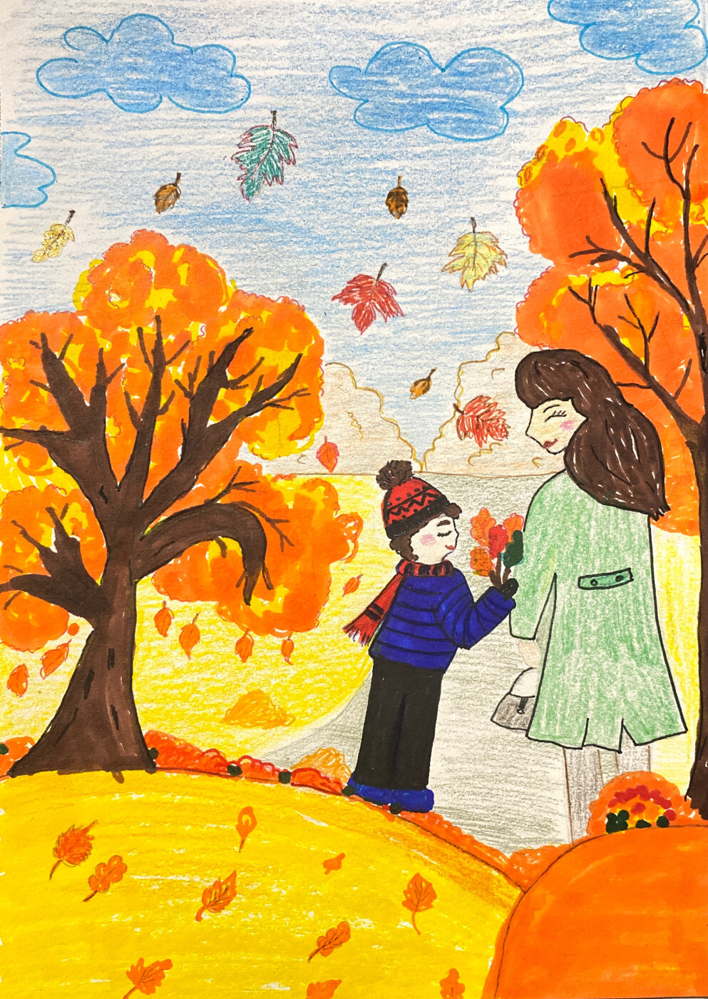 В своём рисунке ребёнок изобразил своё любимое время года-осень.Показал тёплую, осеннюю прогулку с мамой,наслаждаясь временем вместе.
