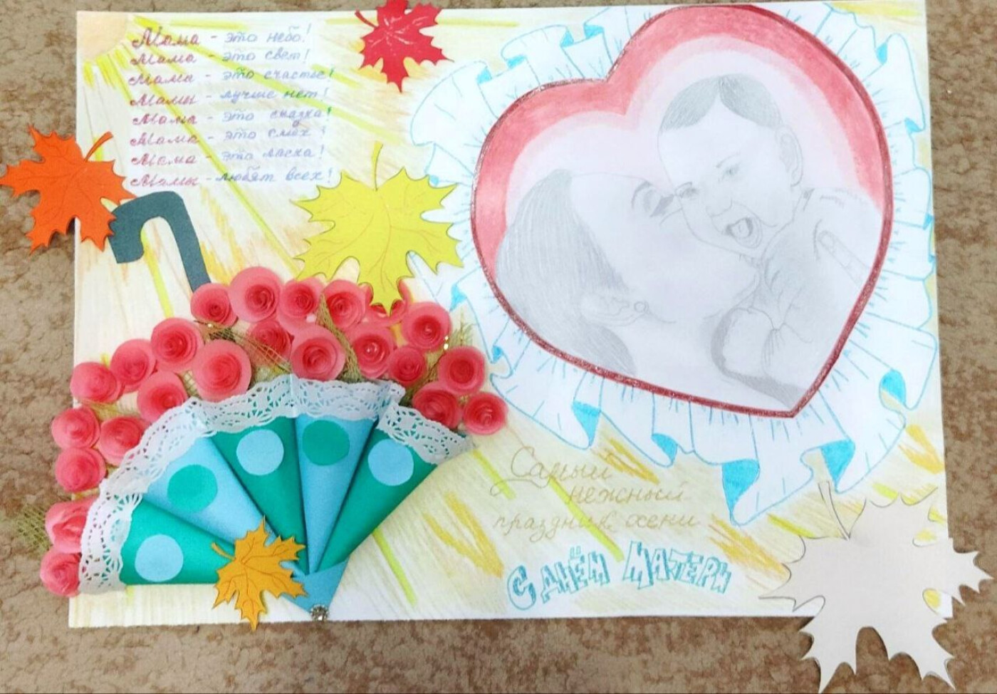 Работа "Мамина нежность" выполнена в смешанной технике (аппликация, карандаш, цветные гелевые ручки).