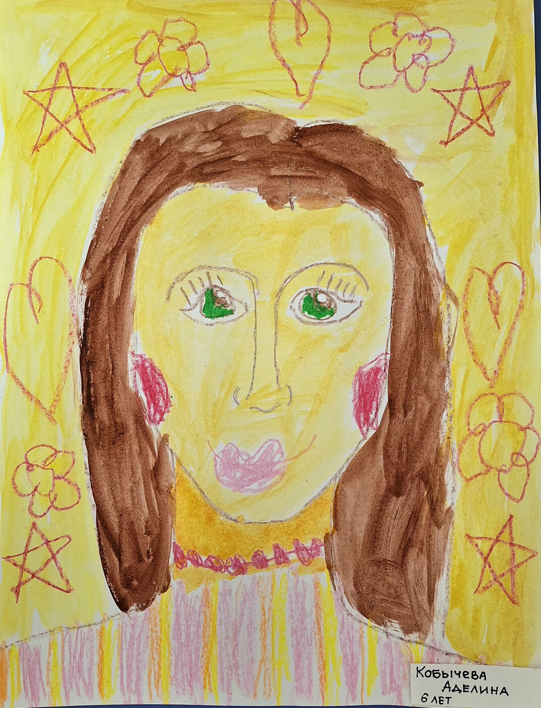 Аделина изобразила свою маму на ватмане формата А3, используя акварель и масляную пастель.