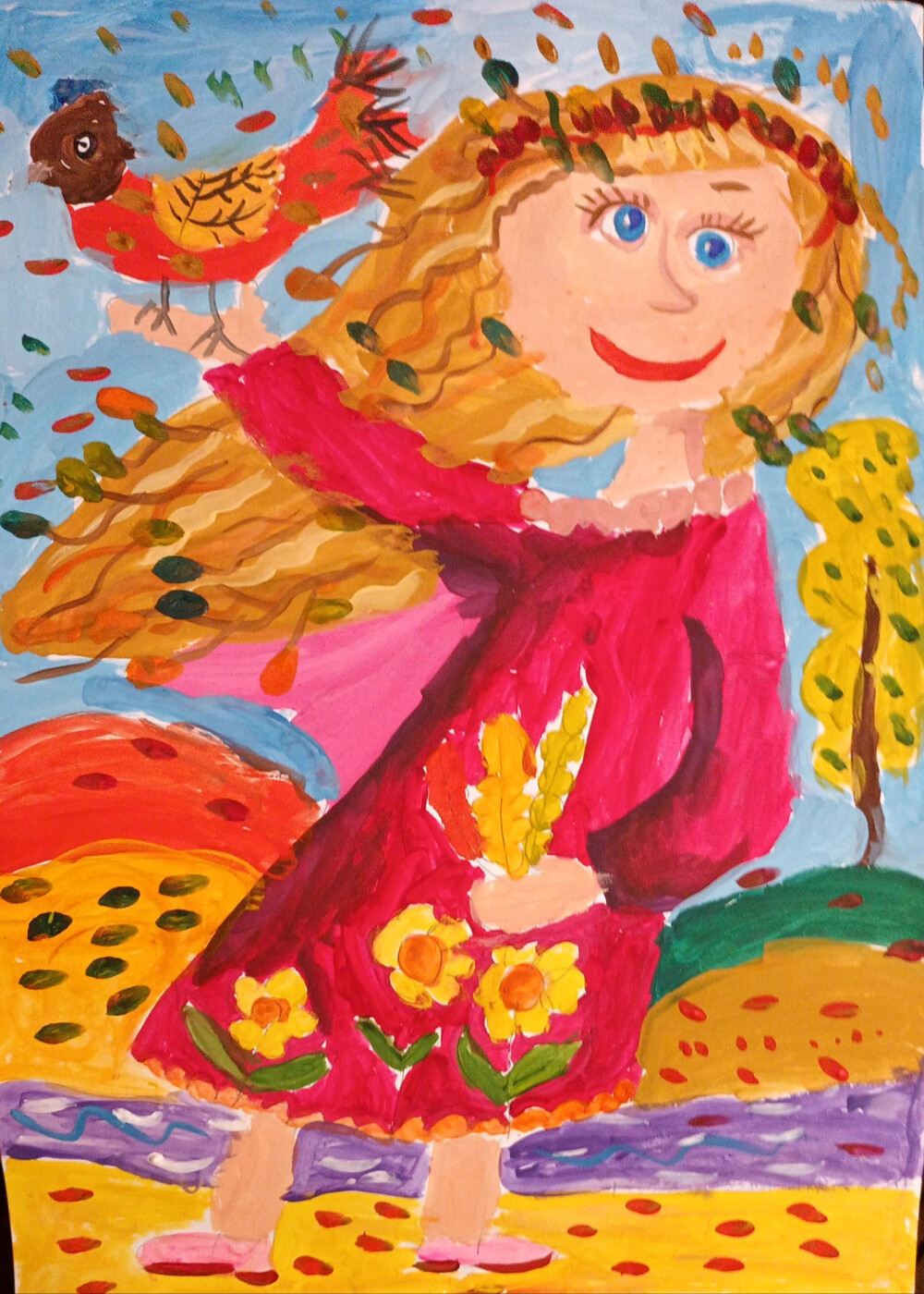Мне очень хотелось нарисовать маму счастливой и радостной и счастливой в руку я её нарисовала птицу желаний.