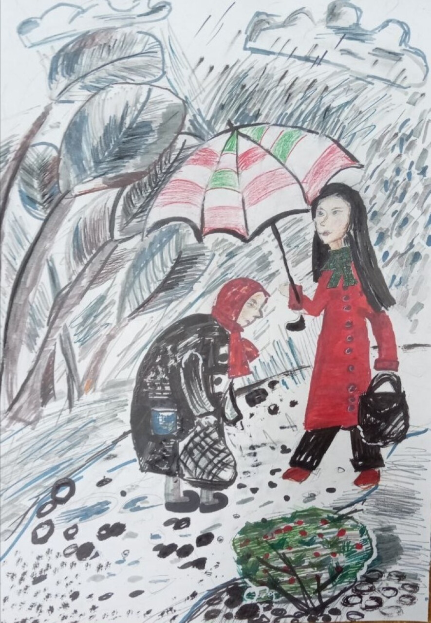 Марина Васюкович, 10 лет, г. Красноярск. "Мама встретила бабулю под дождем и помогла ей не промокнуть."