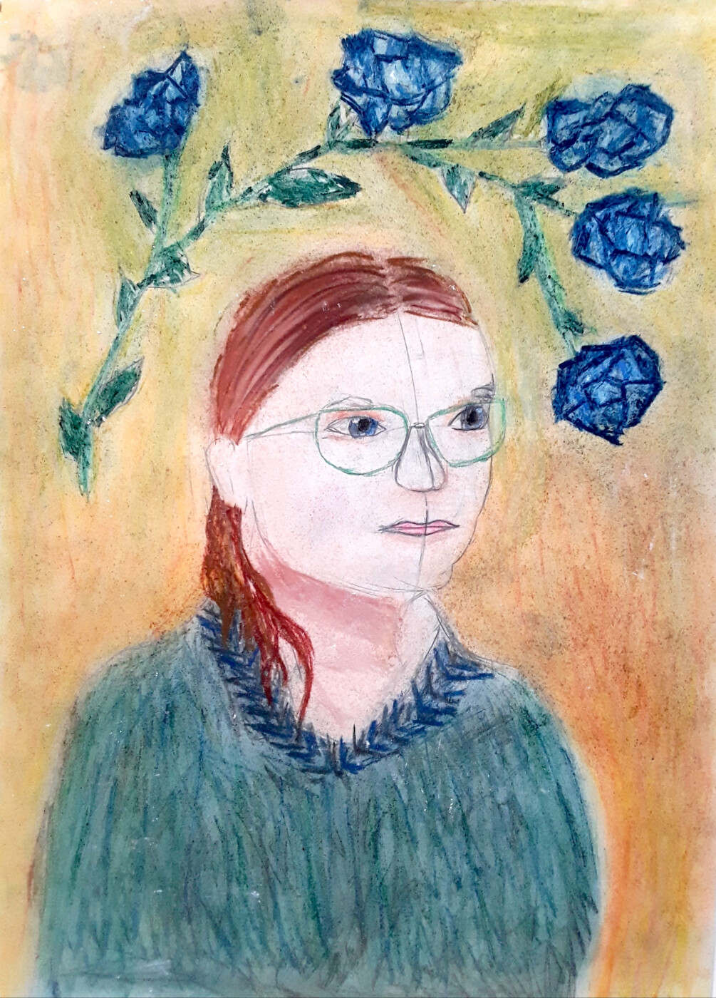 Портрет мамы с ее любимыми цветами. Выполнен сухой пастелью с использованием фиксатива