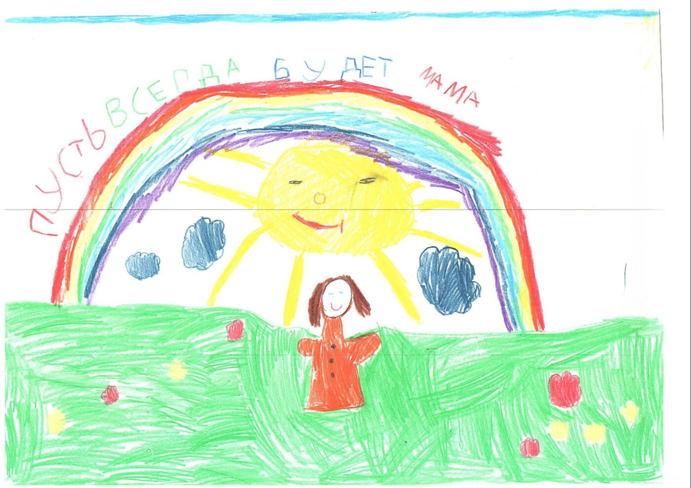 Мамочка моя самая веселая. Я нарисовала радугу, потому что мама такая же красивая! Я ее очень люблю!