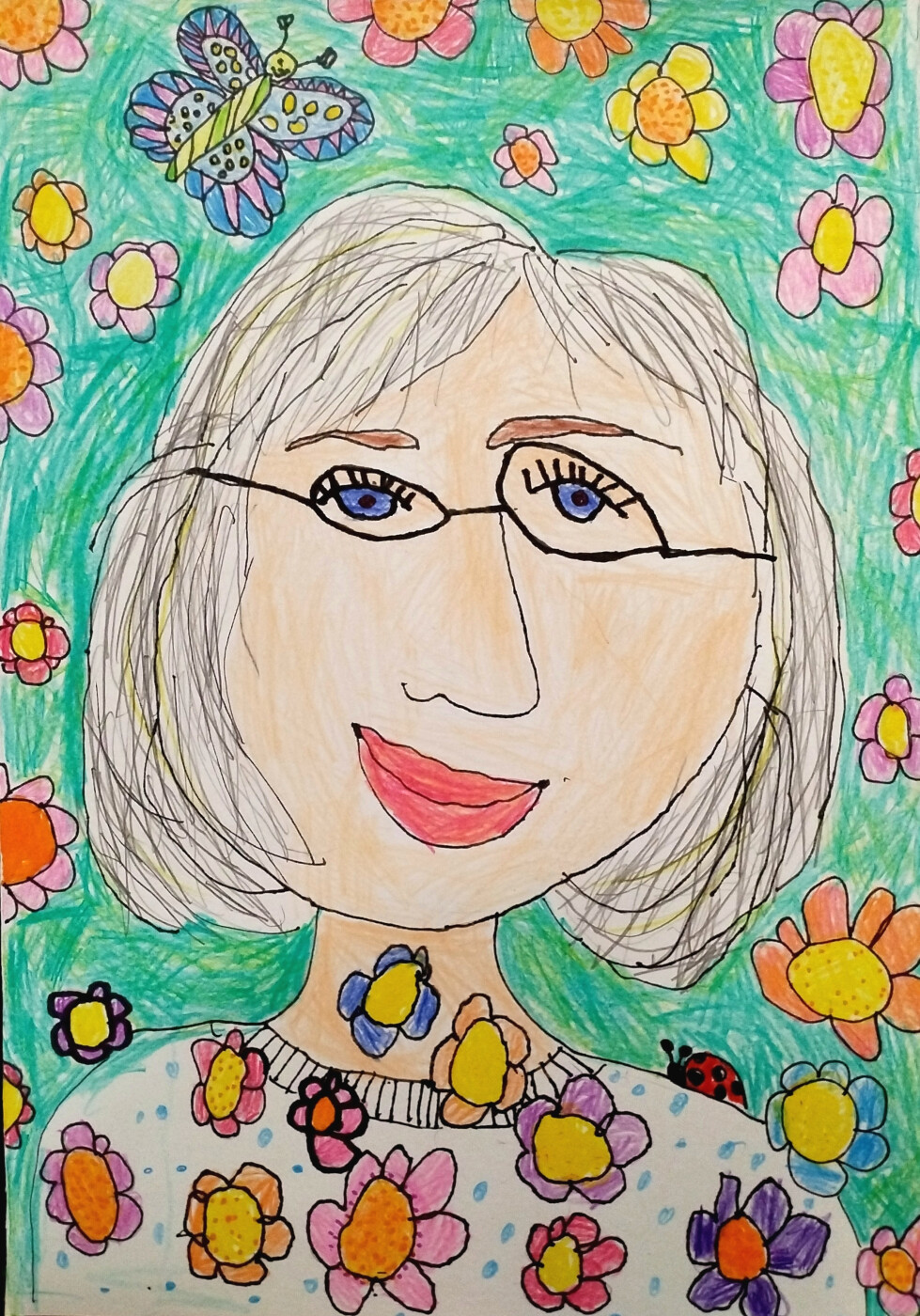 Рисунок на формате А4, цветные карандаши, чёрная гелевая ручка. Маму зовут Катя.