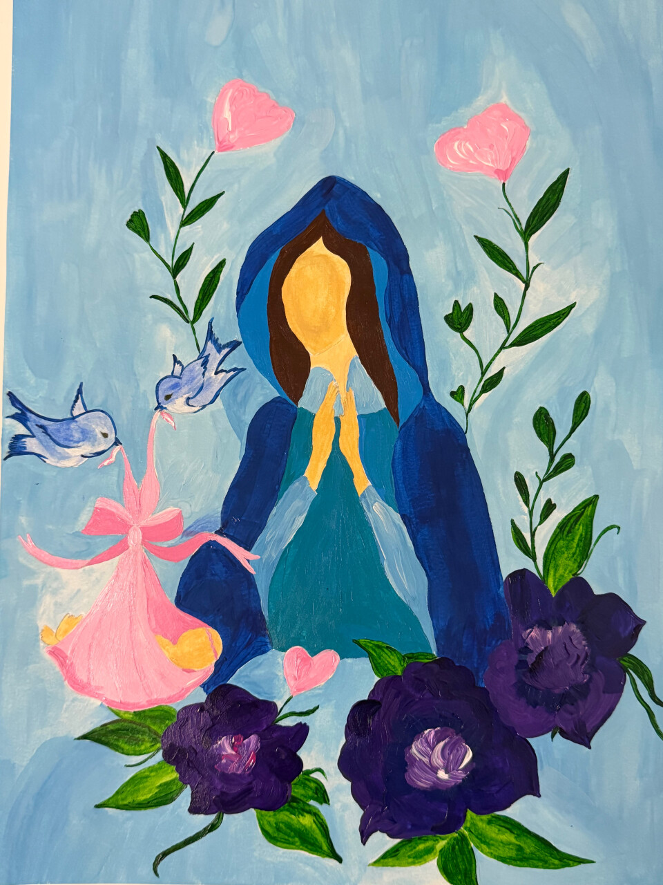 Молитва матери над младенцем. Работа выполнена в технике гуашь и акварель.