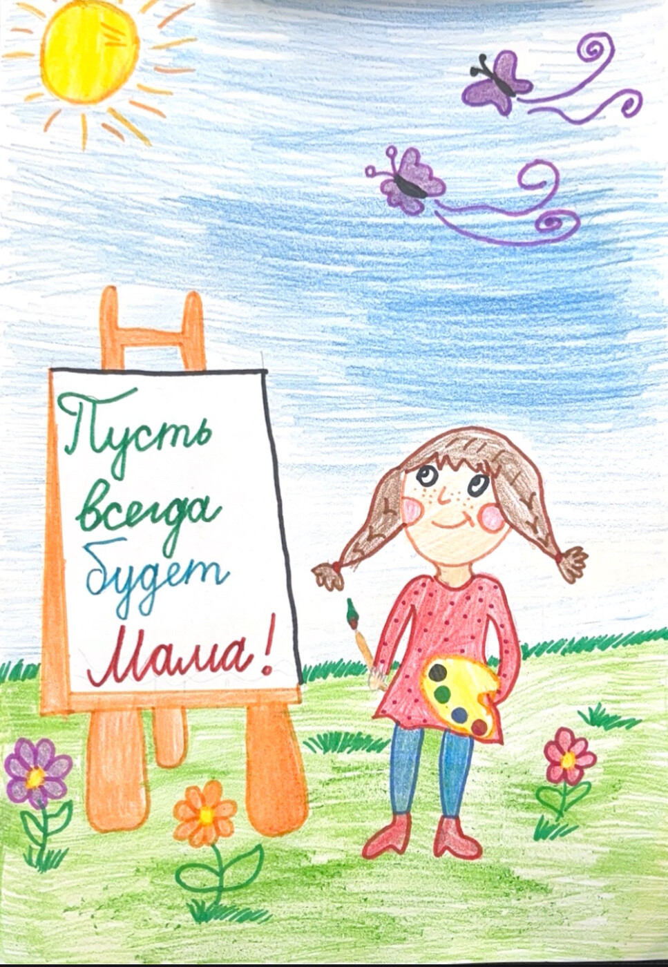 Девочка создает натюрморт с надписью "Пусть всегда будет мама" на холсте. Фон с летними цветами и зеленой полянкой создает атмосферу радости и творчества. Это изображение отражает детскую искренность и любовь к маме, а также творческий подход к выражению своих чувств.