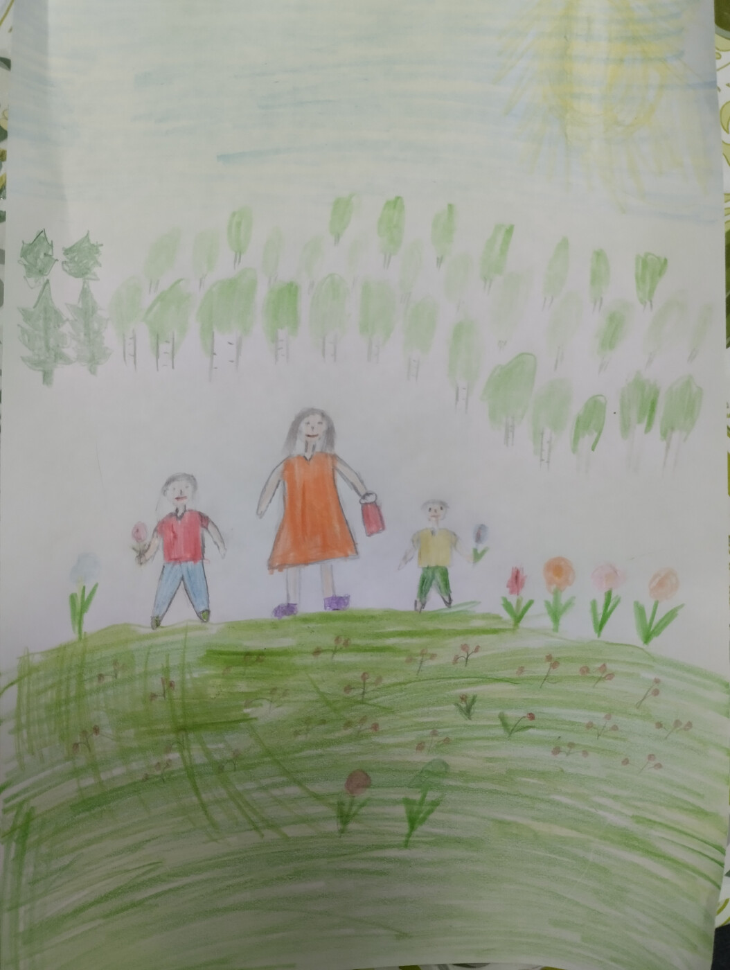 Моя мама очень любит лето. Летом мы часто все вместе ездим в лес за ягодами. На рисунке я нарисовал, как мы собираем самые вкусные лесные ягоды все вместе. Мама , братишка и я.