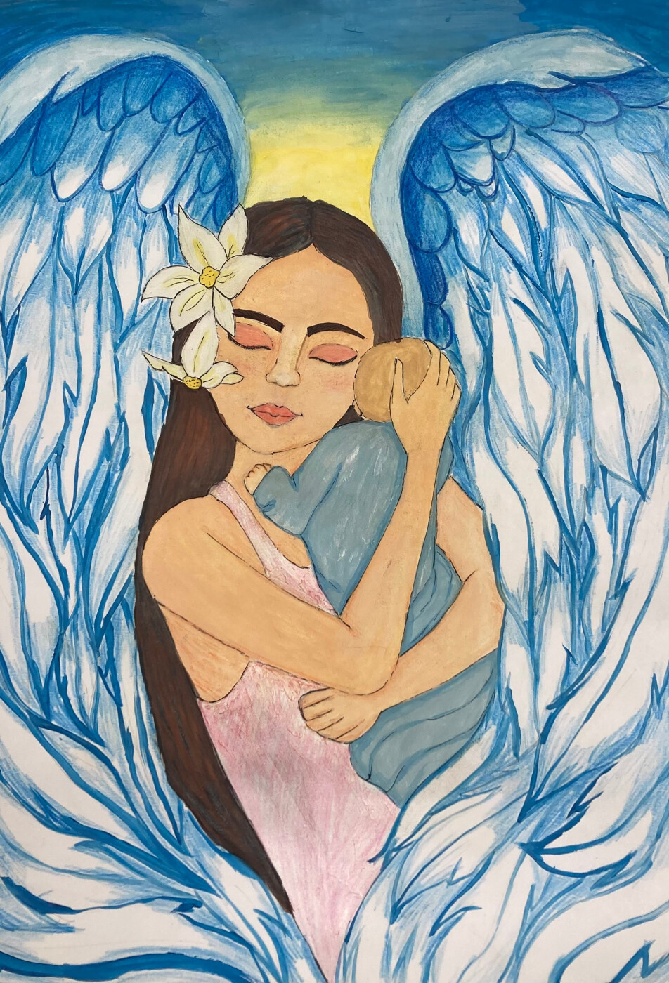 Крылья материнской любви, так назвала я свой рисунок, потому что мама - ангел-хранитель для меня во всей моей жизни. Она заботится, оберегает, любит меня такой, какая я есть. Я надеюсь, что своими успехами в учебе, я помогаю маме держать крылья расправленными.