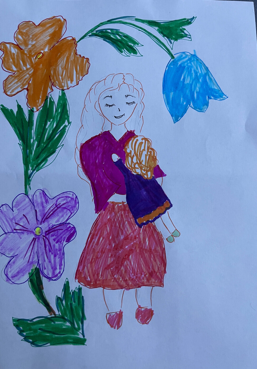 На данном рисунке мама держит на руках дочь, им хорошо вместе. Вокруг растут цветы.