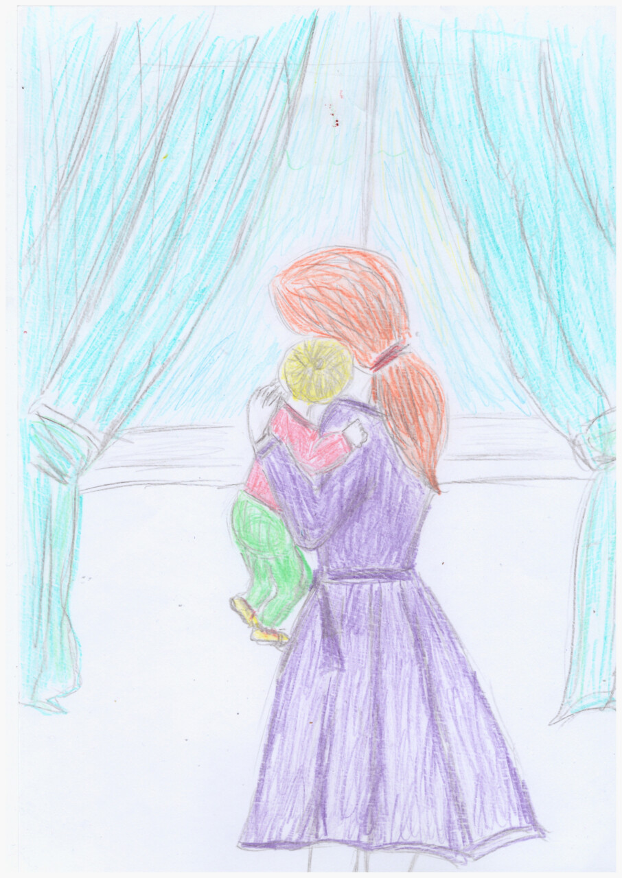 Для рисунка был выбран материал - цветные карандаши. На рисунке изображена мама, которая держит ребенка - самое дорогое в ее жизни.