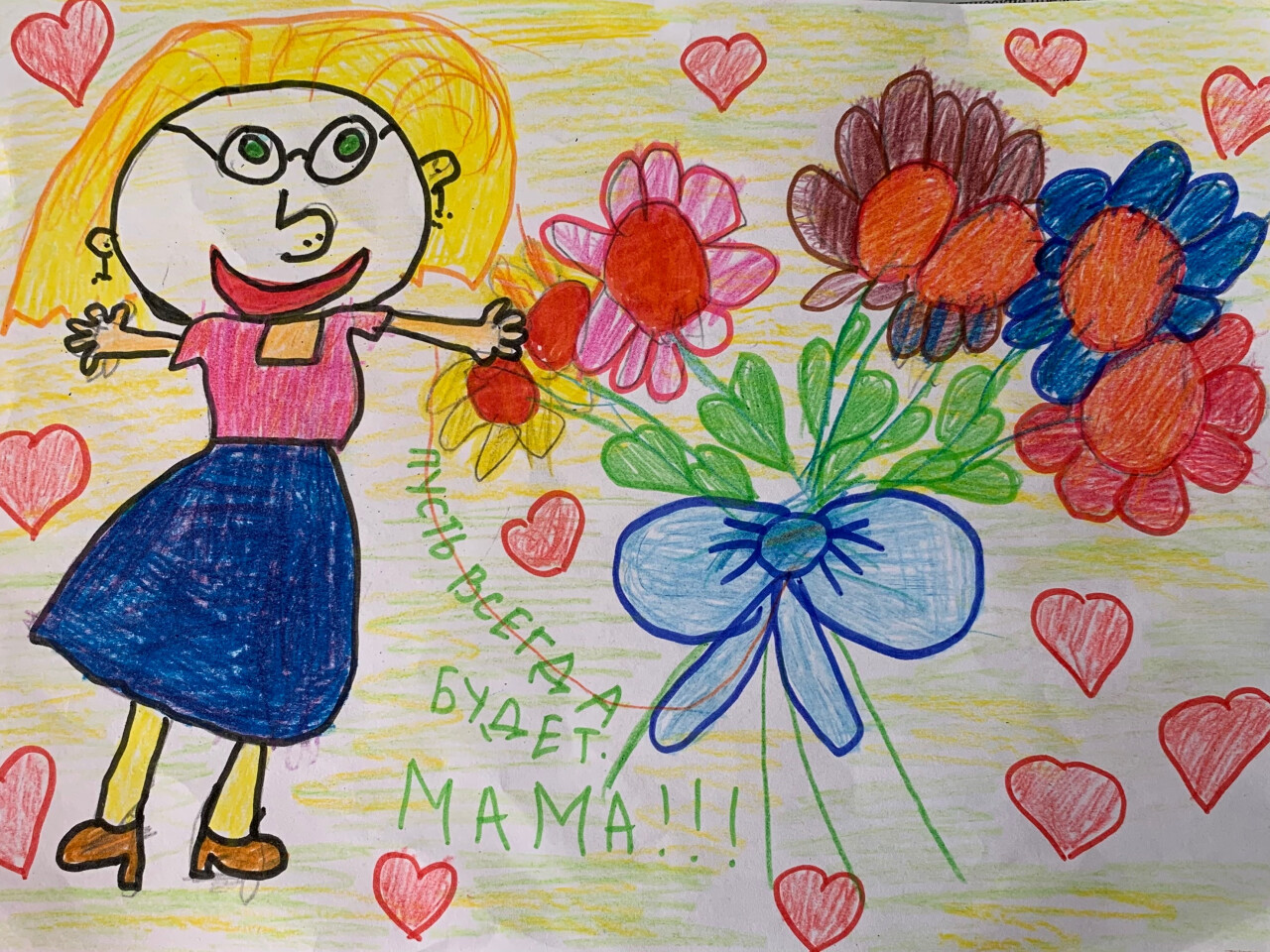 Максим нарисовал рисунок, где изобразил цветы которые, он подарил маме в ее день рождения.